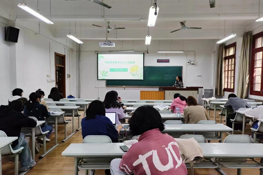 第三组周亿露、史蓓涵两位同学进行了课程《可持续发展与社会心理健康》的汇报,周忆露同学用英文介绍了social psychology的定义,之后具体说明了social cognition、social attitude、social behavior的表现形式并进行了生动得援引、举例,让在座的每一位同学感受到了社会心理健康对可持续发展的重要价值。