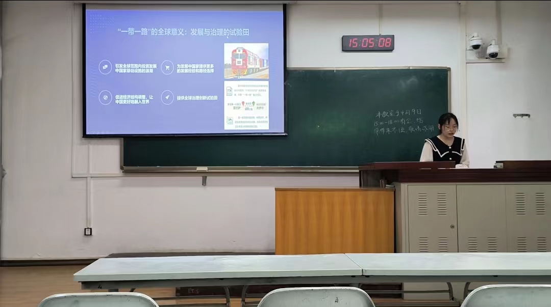 之后,肖婧婧、卢美轩、陈欢三位同学与大家分享了《一带一路与全球发展》这门课程。肖婧婧同学介绍了“一带一路”倡议提出的背景、西方态度以及其包括的议题和意义,同时向大家分享了他们的课程感悟。三位同学的展示让大家对于“一带一路”有了更加全面和深入的认识。